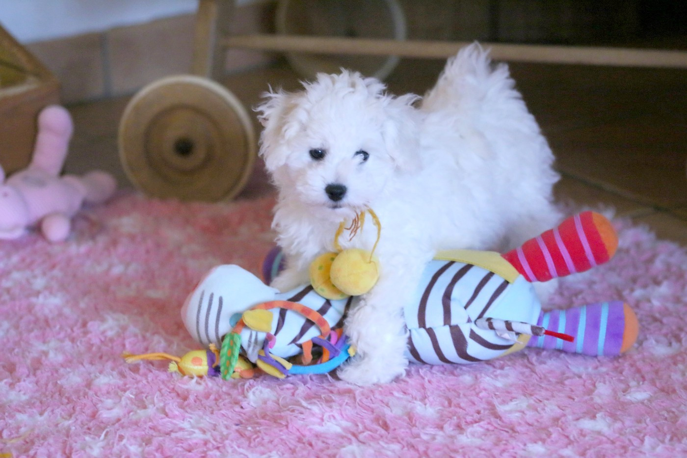 Pour faciliter la transition dans sa nouvelle famille, votre chiot partira avec son tapis et ses jouets